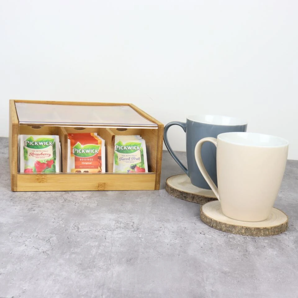 De theedoos van Orange85 is voorzien van 6 ruime vakken en een transparante display deksel. In combinatie met bamboe is deze theedoos een mooie aanwinst in de keuken.