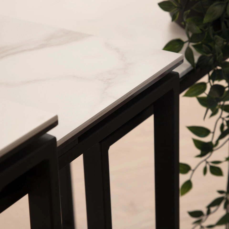 Gemaakt van metaal en keramiek is deze nesttafel perfect voor een eigentijds huis. De mix van keramisch tafelblad en metalen onderstel geeft de tafel een strakke, koele uitstraling. En het ziet er niet alleen goed uit, keramiek is ook heel praktisch omdat het hitte- en krasbestendig is. Je kunt niet fout gaan met deze nesttafel – hij is perfect om extra oppervlakte in je woonkamer te creëren, terwijl hij er stijlvol uitziet.
